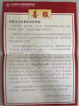一路走来,她十分感恩自己遇到的良师益友。她说,内大数科院,是她梦开始的地方。本科时期,每一次提问老师的循循善诱、细心讲解让她不断感知探索的快乐;每一次讨论时老师的畅所欲言让她常常被新的知识所惊艳。无论是专业知识、学习习惯、亦或为人处世,都对她产生潜移默化的影响。在北师大,她幸运地选择到了自己本科时就关注的学者作为导师,在她初入系统科学不适应时,导师与她分享自己的求学故事,润物细无声;科研不顺利的日夜里,她的导师都予以她充分信任与支持,鼓励她大胆尝试,与她一起头脑风暴。长路漫漫,正是因为有这样一群老师,作为学者一丝不苟,作为长者耐心无私,让她有了不断前行的勇气与目标!