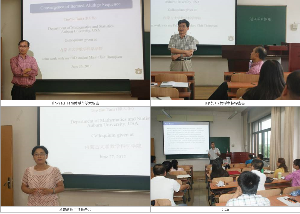 应bg大游集团官方网站邀请,2012年6月26、27日,美国Auburn大学Tin-Yau Tam教授在公司综合楼0212教室作有关矩阵与算子理论的学术报告,并为青年教师和研究生作数学专业学术论文写作的报告,报告会分别由公司教务处处长阿拉坦仓教授、bg大游集团官方网站副经理李宏教授主持,bg大游集团官方网站的研究生和有关研究方向的教师参加了报告会。