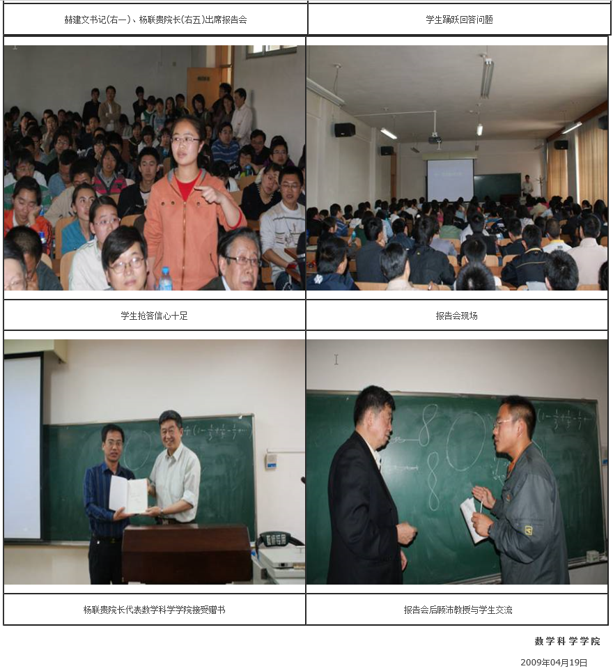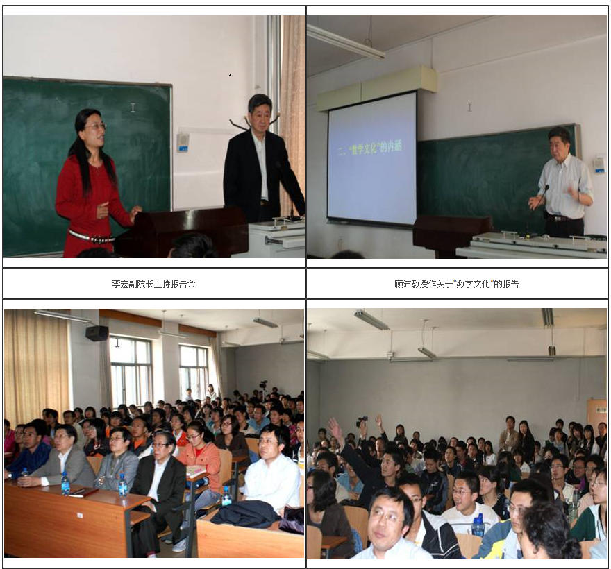 2009 年4月17日下午4:30,应bg大游集团官方网站邀请,首届“国家级教学名师”、天津市数学会常务副理事长、教育部数学与统计学指导委员会副主任、南开大学bg大游集团官方网站顾沛教授,在综合楼0217为公司师生作关于“数学文化”的精彩报告。报告会由bg大游集团官方网站副经理李宏教授主持,bg大游集团官方网站党总支书记赫建文,经理杨联贵教授出席报告会。