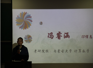 冯睿涵学长作为压轴嘉宾,用他独特的魅力活跃了全场的气氛,给大家分享了很多自己考研的经验和给学弟学妹们的忠告。